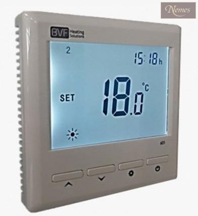 Alkalmazás: Elektromos fűtés, padlófűtés (padlófűtés szenzor gyári tartozék) Feszültség: 230VAC, 50/60Hz Relé terhelhetőség: 3600W/16A (javasolt: max. 3200W/14A) (értékesítő ajánlás: 2500w) K. áramfelvétel: 2W Kijelző: LCD fehér háttérvilágítással Külső érzékelő: NTC szabvány 10KΩ @ 20°C Szerelvényház: ABS UL94-5 tűzállósági szabványfokozat Mérési tartomány: 5°C – 80°C, 0,5°C lépcsőkben Beáll. pontosság: ± 0,5°C IP besorolás: IP 30 Programlehetőségek: Heti 5/1/1; napi 4 ciklusidő Relé beépítési méret: 86mm/88mm/18mm (65 dobozba, min 55mm mélység) A BVF 601 szobatermosztát egyszerű és megbízható rendszer vezérlő mindazoknak akik kiegészítő funkciók és távoli elérés lehetősége nélkül alakítanák ki fűtési rendszerüket. A BVF 601 és 601i termosztátok mindössze a kommunikációra képes moduljukban különböznek. Napi négy időprogrammal a hét minden napjára nyújt beállítási lehetőséget. Kapcsolási teljesítménye a BVF termosztátoktól megszokott valós 16A, nem szükséges teljesítménykapcsoló relé beépítése. Letölthető használati utasítás: BVF 601 termosztát Használati-kezelési utasítás