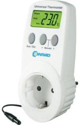 Az univerzális konnektor termosztát mutatja a be- és kikapcsolási hőmérsékletet, valamint az aktuális hőmérsékletet is. A termosztát a konnektorba csatlakoztatva a rákapcsolt fogyasztót a beállított hőmérséklet kapcsolási pontoknál ki-bekapcsolja. Egyedi készülékként való felhasználásán túlmenően mechanikus termosztátok helyettesítésére is használható. Így például egy hibás termosztátú hűtőszekrény a dugaszolóaljzatba becsatlakoztatott termosztáttal be- és kikapcsolható. A 2 méter csatlakozóvezetékkel ellátott hőmérséklet érzékelőt egyszerűen a hűtőszekrényen belül, egy alkalmas helyen kell elhelyezni. Gyakori kérdések - válaszok: Nedves helységben (pl. fürdőszoba) használható? - Igen, maximum 90 %-os páratartalomig.