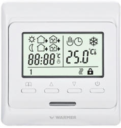 Nyomógombos kivitel, felhasználóbarát kezelőfelület. Warmer E51/M6 programozható szobatermosztát padlószenzorral. 16A-es kapcsolási teljesítménnyel (3600W) és változtatható szenzor beállításokkal alkalmas minden típusú elektromos fűtés, fűtőpanel, infrapanel, fűtőfilm, fűtőfólia és elektromos padlófűtés vezérlésére. Könnyű szerelhetőség és diszkrét megjelenés jellemzi. Az E 51 M6 padlószenzoros termosztát egy időben méri és limitálja a padló felületi hőmérsékletét és a levegő beállított értékeit.